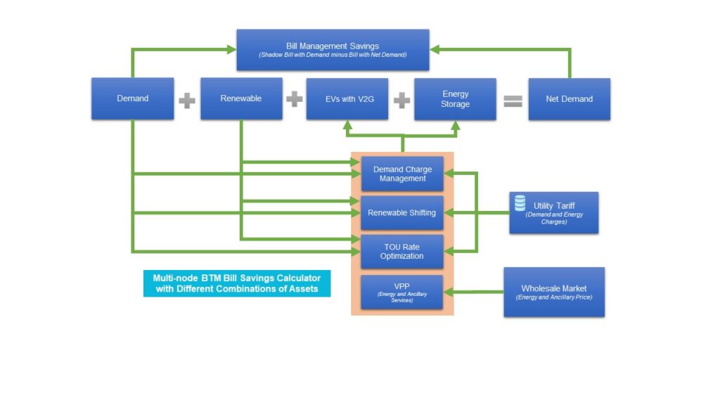 Navigating the complex economic analysis and bill management savings calculations involves the forecasting of multiple revenue and value streams, predicting load patterns and solar generation, and modeling the dispatch and performance of a variety of on-site distributed energy resources. The optimization of revenue / value streams, technologies, and asset sizes is best conducted by a Multi-node, BTM Bill Savings Calculator with Different Combinations of Assets.