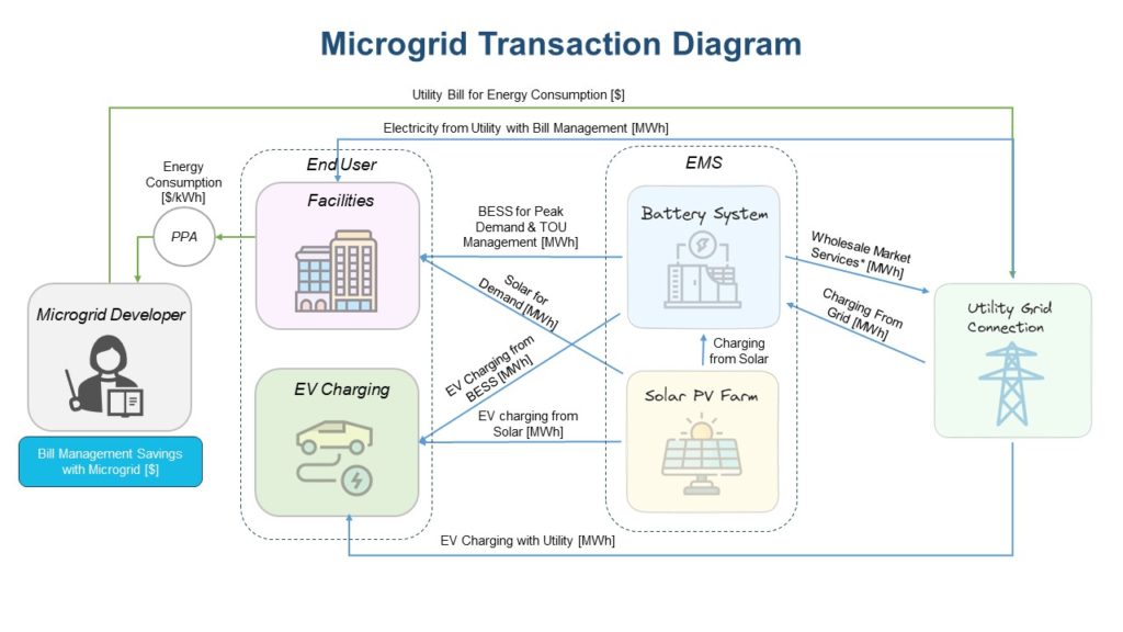 Specifically, in southern California, the dynamics of offering a C&I microgrid to an end user were significantly altered with the introduction of the Net Energy Metering (NEM) 3.0 policy. NEM 3.0 significantly lowered the rate utilities paid for exporting solar. This new dynamic moved the focus of solar-enabled microgrids from exporting excess solar to shifting solar generation to serve load during peak periods with energy storage. The transaction diagram below shows energy flow (blue) and the flow of money (green) in a microgrid with solar, storage, EV chargers, and traditional facility load: