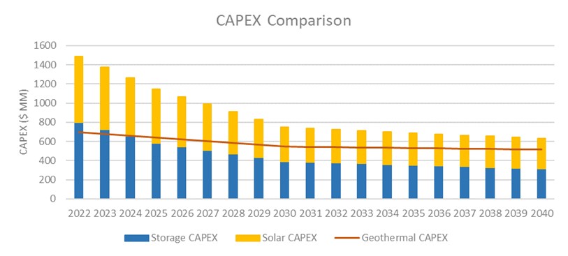 The capital cost comparison shows that the 24-hour continuous solar plus storage is more expensive than the equivalent geothermal to produce the same amount of output where the geothermal is non-weather dependent clean energy and makes for a better baseload to supply demand requirements.